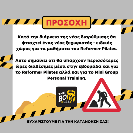 Η διαρρύθμιση αυτή θα γίνει προκειμένου να μπορούμε να εξυπηρετούμε περισσότερο κόσμο έχοντας περισσότερες ώρες στην διάθεση μας και για το Reformer Pilates αλλά και για το Mini Group Personal Training μιας και θα φτιαχτεί νέος ειδικά διαμορφωμένος χώρος για το Reformer Pilaes.